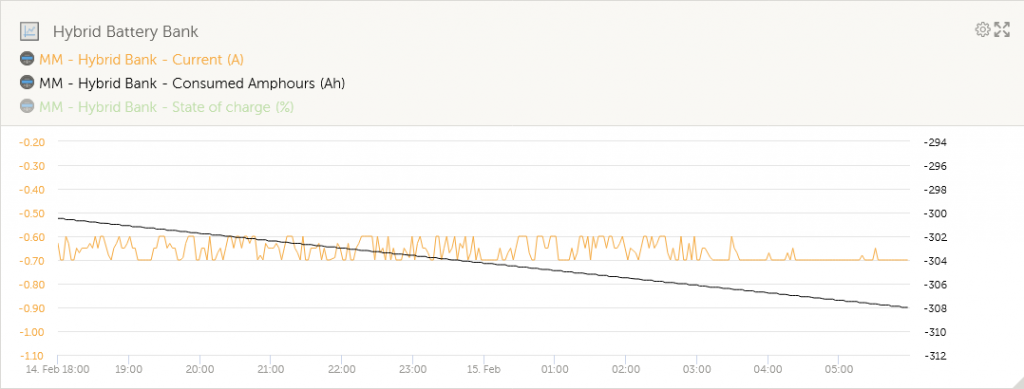 In terms of draw from the battery, the Battery bank dropped from -300.5Ah to -308Ah in the 12 Hours.