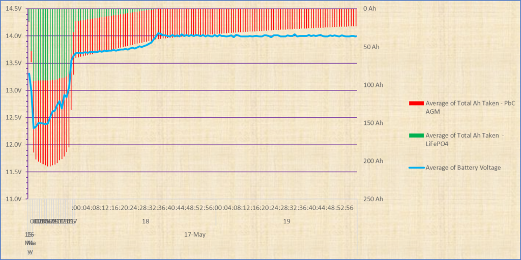 With the Lead -Lithium mix however, the LiFePO4 battery will be presented with the 14.xV voltage for potentially many hours if the Lead Bank got some good use (as in our example here where we took 110Ah out the bank) and needs recharging.