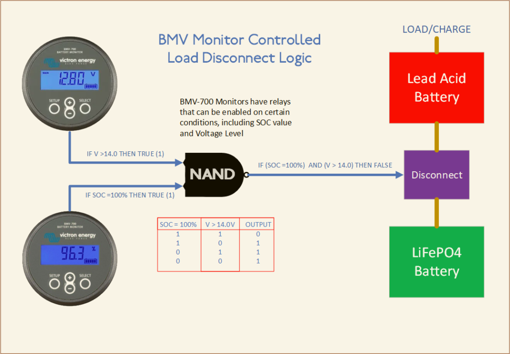 - IF SOC = 100% AND V >14.0V THEN Disconnect Lithium. So this means battery is full and there is no system load that requires any battery power.