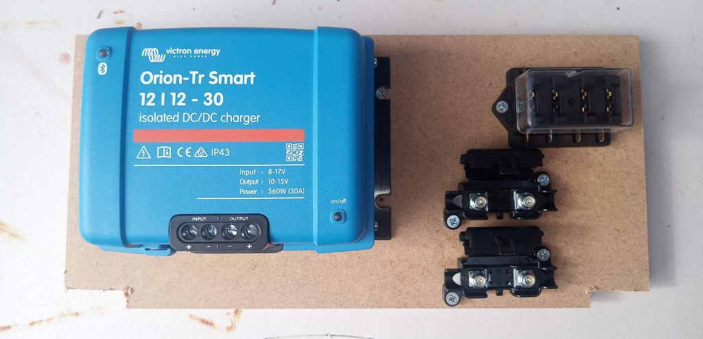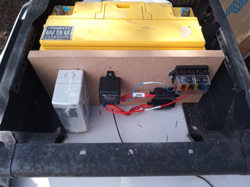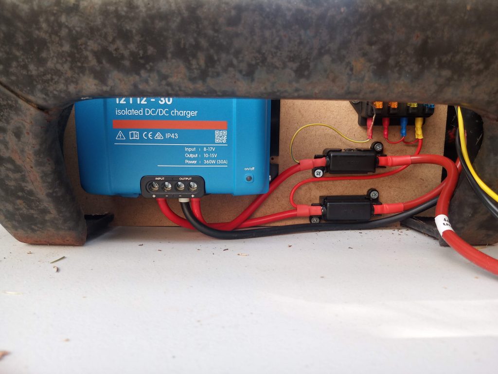 A benefit of the VSR-type setup is the Cyrix is a lot smaller than the B2B as can be seen from the photo above. This layout allows the extra option of a small 2-way consumer unit (shown on the left) into which an RCBO/RCD can be fitted to provide a protected 240V hookup circuit and a 240V socket provided (this 240V kit is not part of the Combo kit, but can be provided as an extra kit).