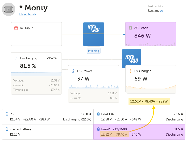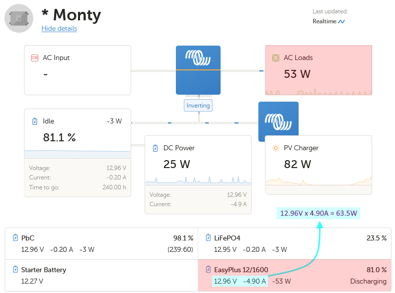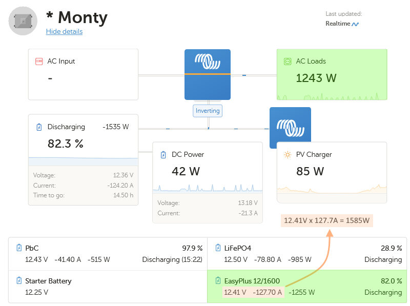 The screenshot below from Victrons VRM platform showing the Dashboard of my Motorhome (“Monty”) while the fridge is running. I have highlighted in Pink the key information points.