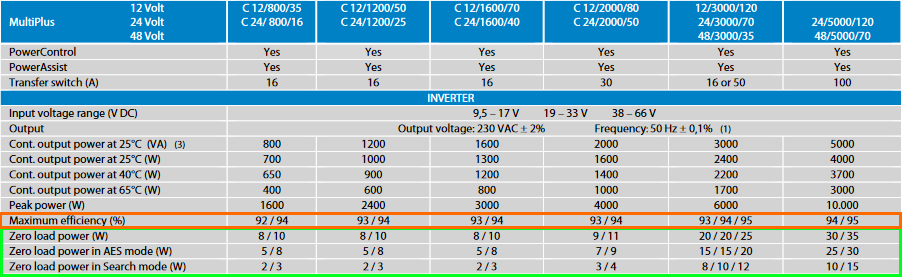 The Zero Load Power use is useful to know as well. According to the Victron Datasheet posted at the top, the MultiPlus 12/1600 Zero Load is either 8W, 5W or 2W, depending on how you set it up.